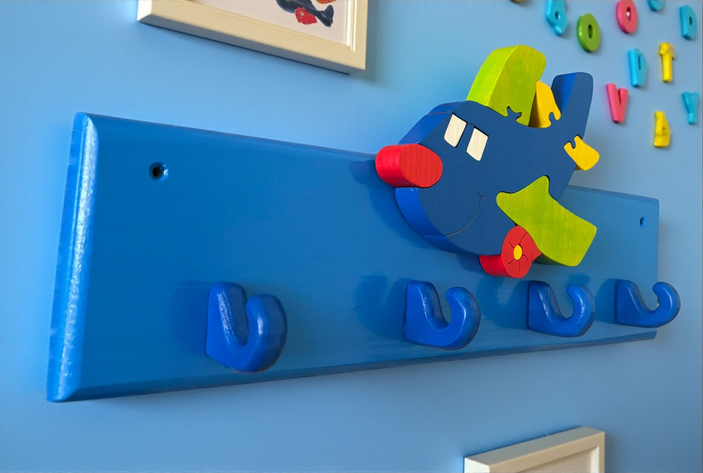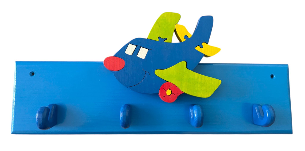 Kőrisfából készült 4 akasztós gyermek fogas, repülő dísszel.