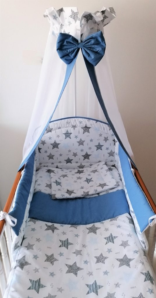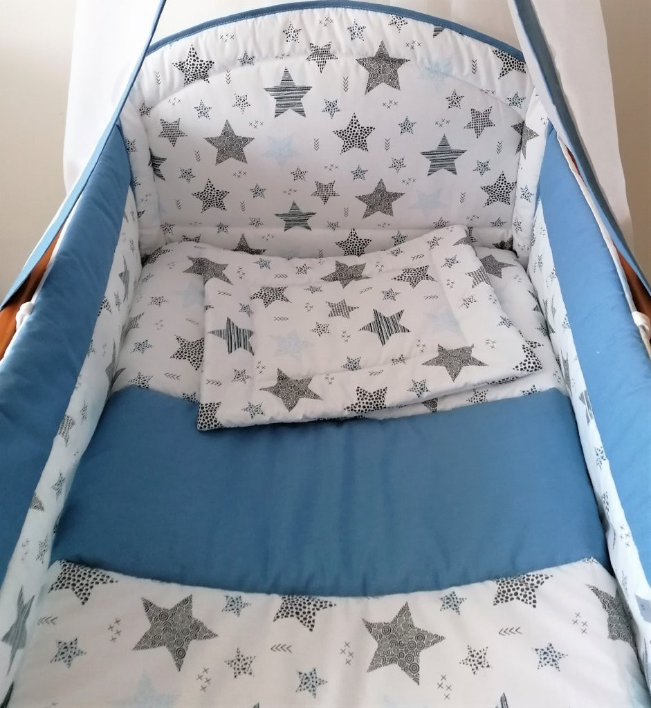 A babaágynemű szett tartalma takaró- és párna huzat, rácsvédő, baldachin