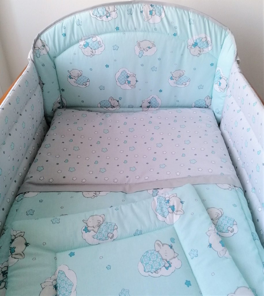 A babaágynemű szett tartalma takaró- és párna huzat, rácsvédő, baldachin