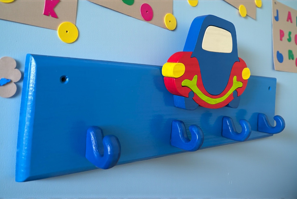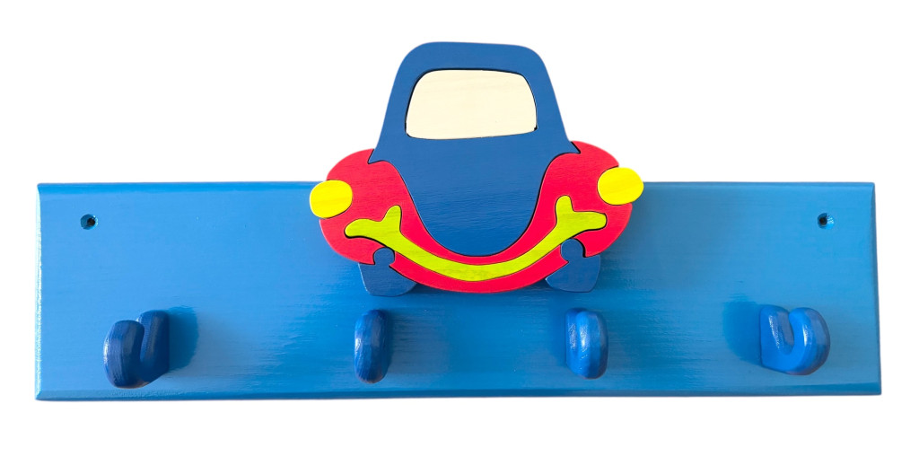 Kőrisfából készült 4 akasztós gyermek fogas, autós dísszel.