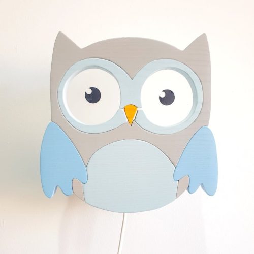 Bagoly fali lámpa, szürke/kék - gyereklámpa fából
