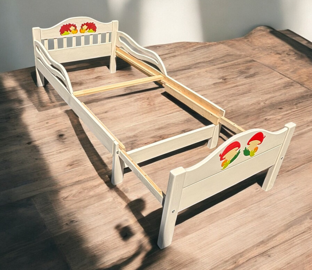 Bővíthető gyerekágy fából, törtfehér színben, 2-2 gomba süni dísszel, 80x140-180 cm