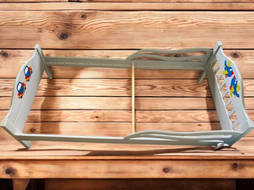 Kőrisfából készült ágykeret, szürke színben, láb résznél 2 autó fej résznél 2 repülő dísszel.